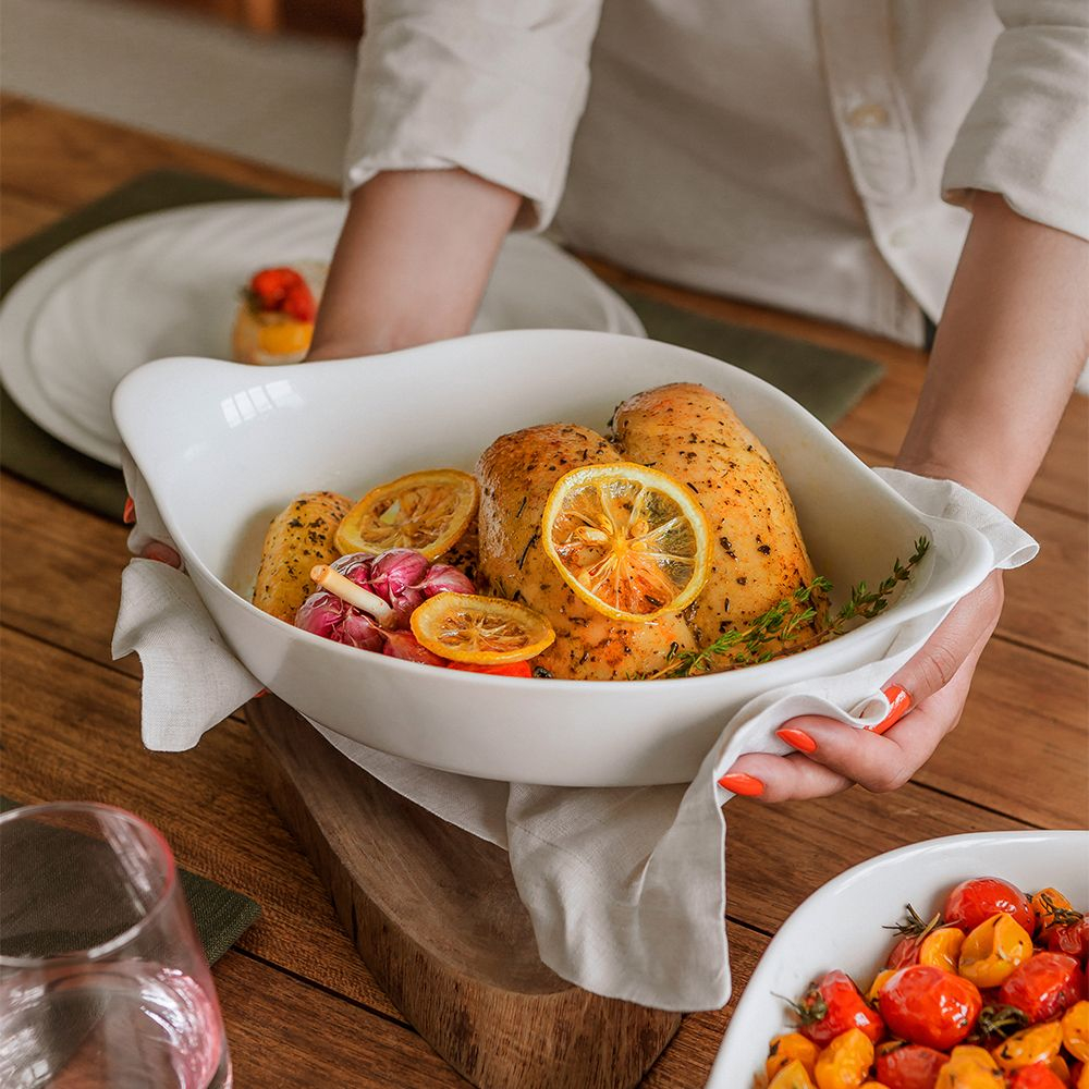 Tava are forme organice si manere ergonomice. Aceasta poate fi folosita pentru preparare, coacere si servire fiind ideala pentru conceptul de cook&serve, putand merge din cuptor direct pe masa.