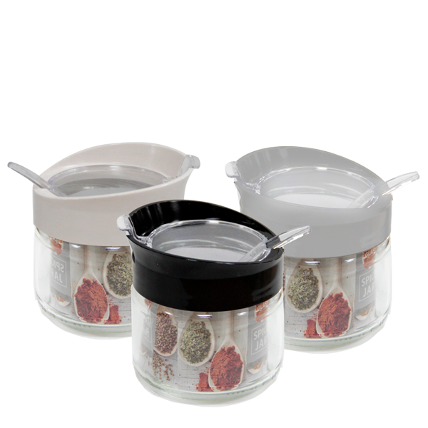 Borcan sticla cu lingurita pentru condimente, 300ml, capac plastic de diferite culori RAKI OTTO