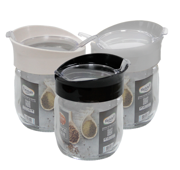 RAKI OTTO Borcan sticla cu lingurita pentru condimente, 425ml, capac plastic de diferite culori.