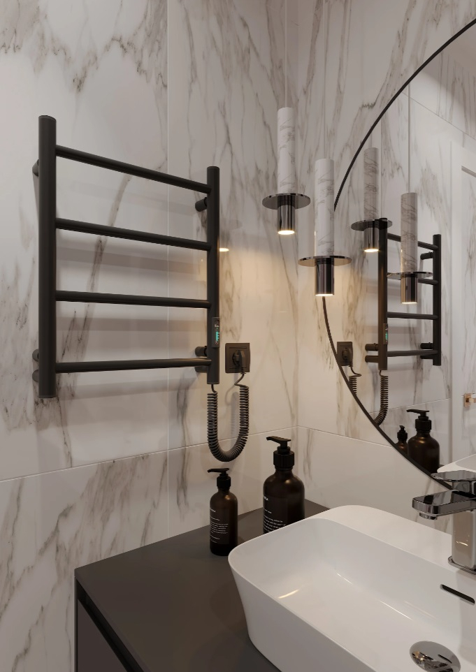 Urmand tendintele la nivel mondial in amenajarea interioara a baii, va prezentam suportul electric pentru prosoape LADDER 4 cu finisaj negru mat. Decizie de design perfecta pentru clientii care sunt total indragostiti de culorile industriale si formele concise ale metalului. Acest incalzitor electric pentru prosoape are in interior un cablu de incalzire uscat si flexibil. Nu are nevoie de lichide suplimentare, trebuie doar conectat la curent si functioneaza! Se incalzeste la temperatura maxima in cateva minute. Este extrem de convenabil atunci cand doriti sa uscati rufele rapid sau sa va incalziti prosopul dupa ce ati parasit baia.