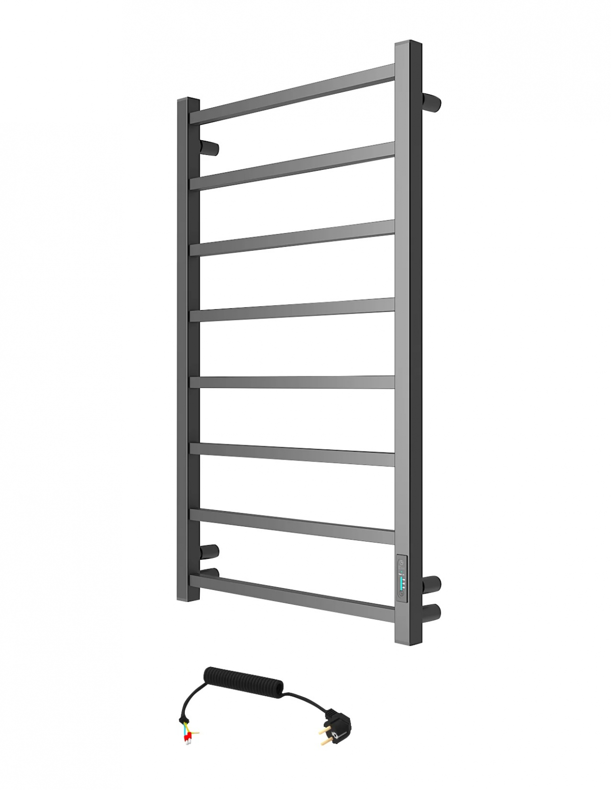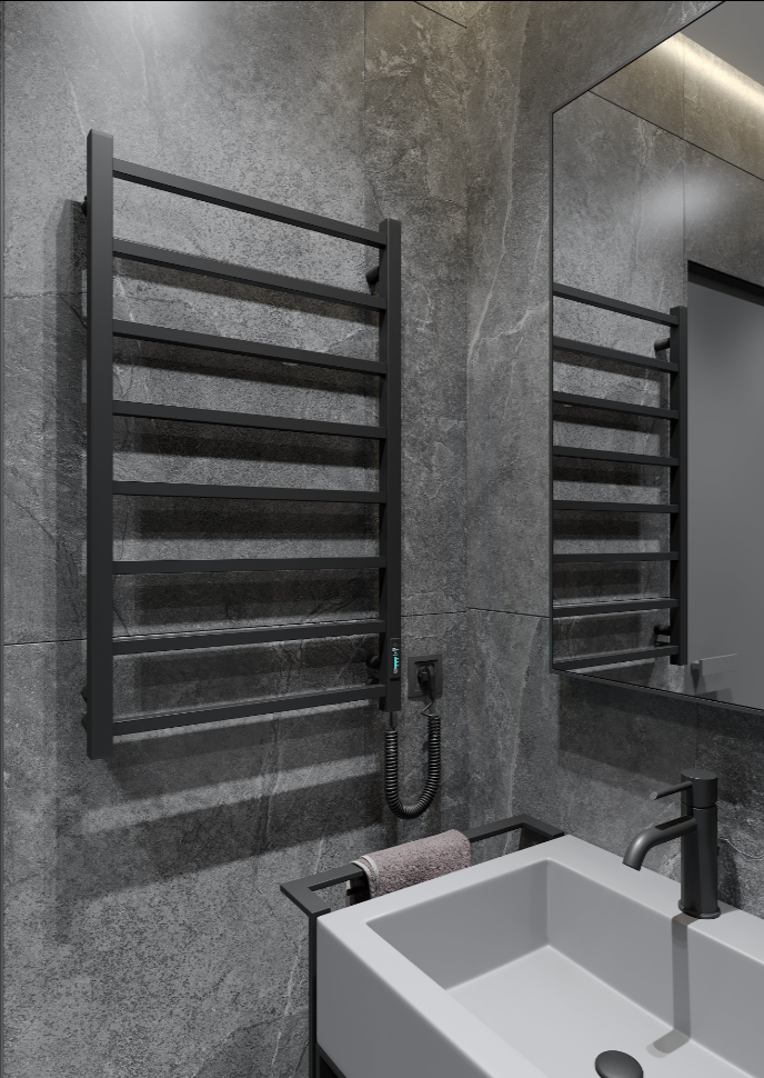 Urmand tendintele la nivel mondial in amenajarea interioara a baii, va prezentam suportul electric pentru prosoape ATRIA 8 cu finisaj negru mat. Decizie de design perfecta pentru clientii care sunt total indragostiti de culorile industriale si formele concise ale metalului. Acest incalzitor electric pentru prosoape are in interior un cablu de incalzire uscat si flexibil. Nu are nevoie de lichide suplimentare, trebuie doar conectat la curent si functioneaza! Se incalzeste la temperatura maxima in cateva minute. Este extrem de convenabil atunci cand doriti sa uscati rufele rapid sau sa va incalziti prosopul dupa ce ati parasit baia.