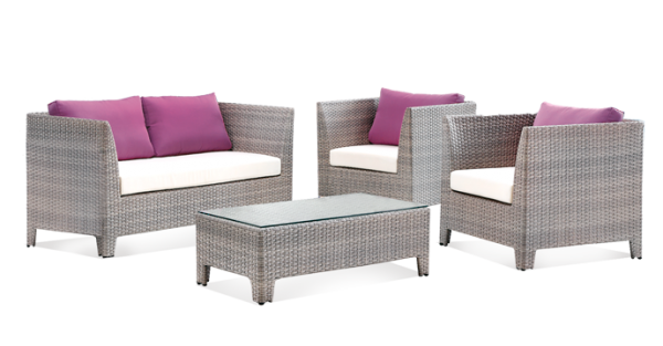 RAKI TERESINA Set mobilier terasa poliratan 4 piese, masa, canapea, 2 fotolii gri cu perne mov